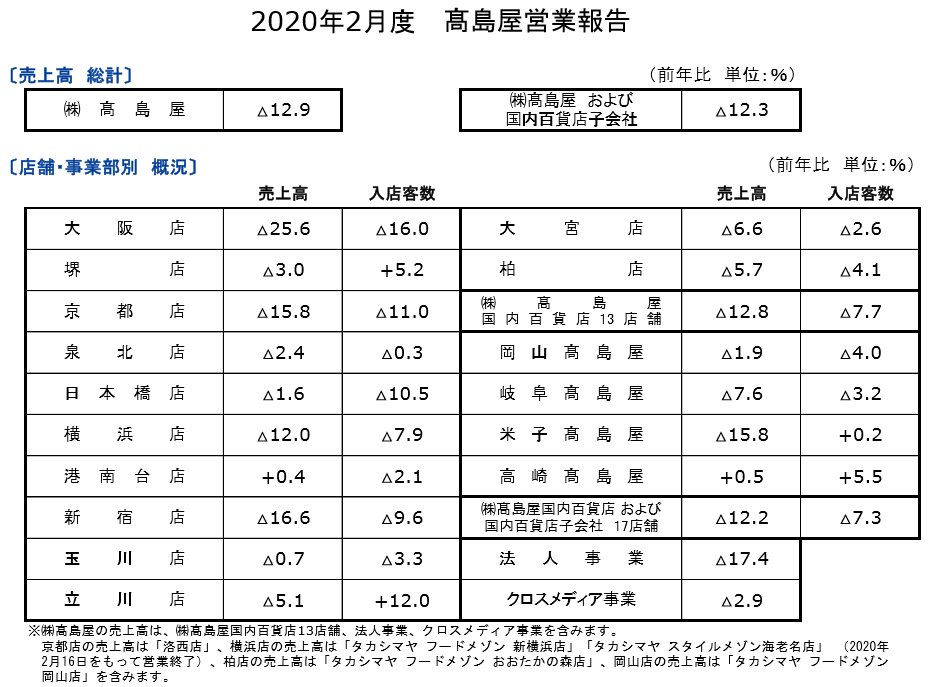 本日、百貨店大手の高島屋が2月の営業報告を発表しました。下記の通りで、前年同月比10%以上の減収です。